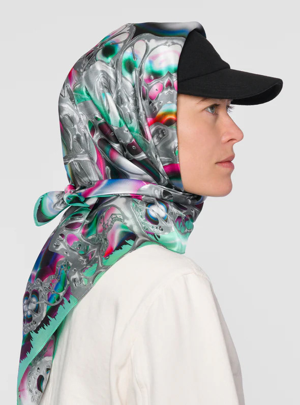 The imaginary sceneries are digital art transformed into high-quality silk scarves.